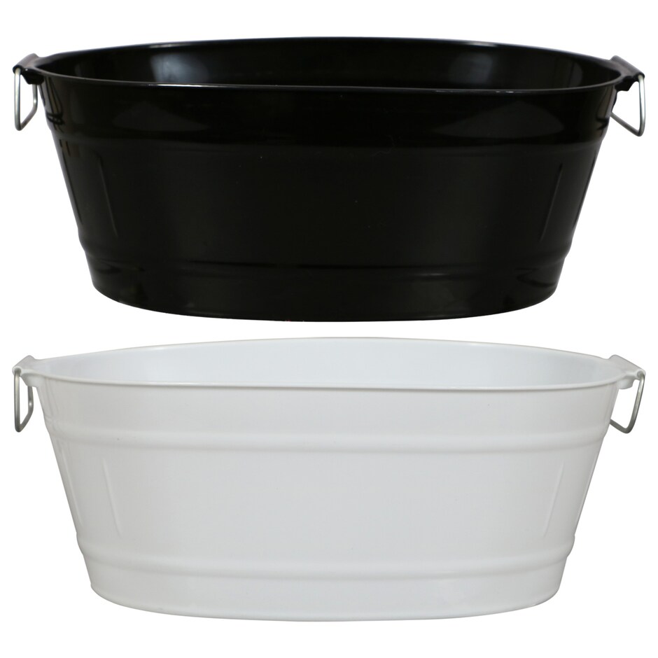 Plastic oval tubs come in orange navy blue and red harvest colors.